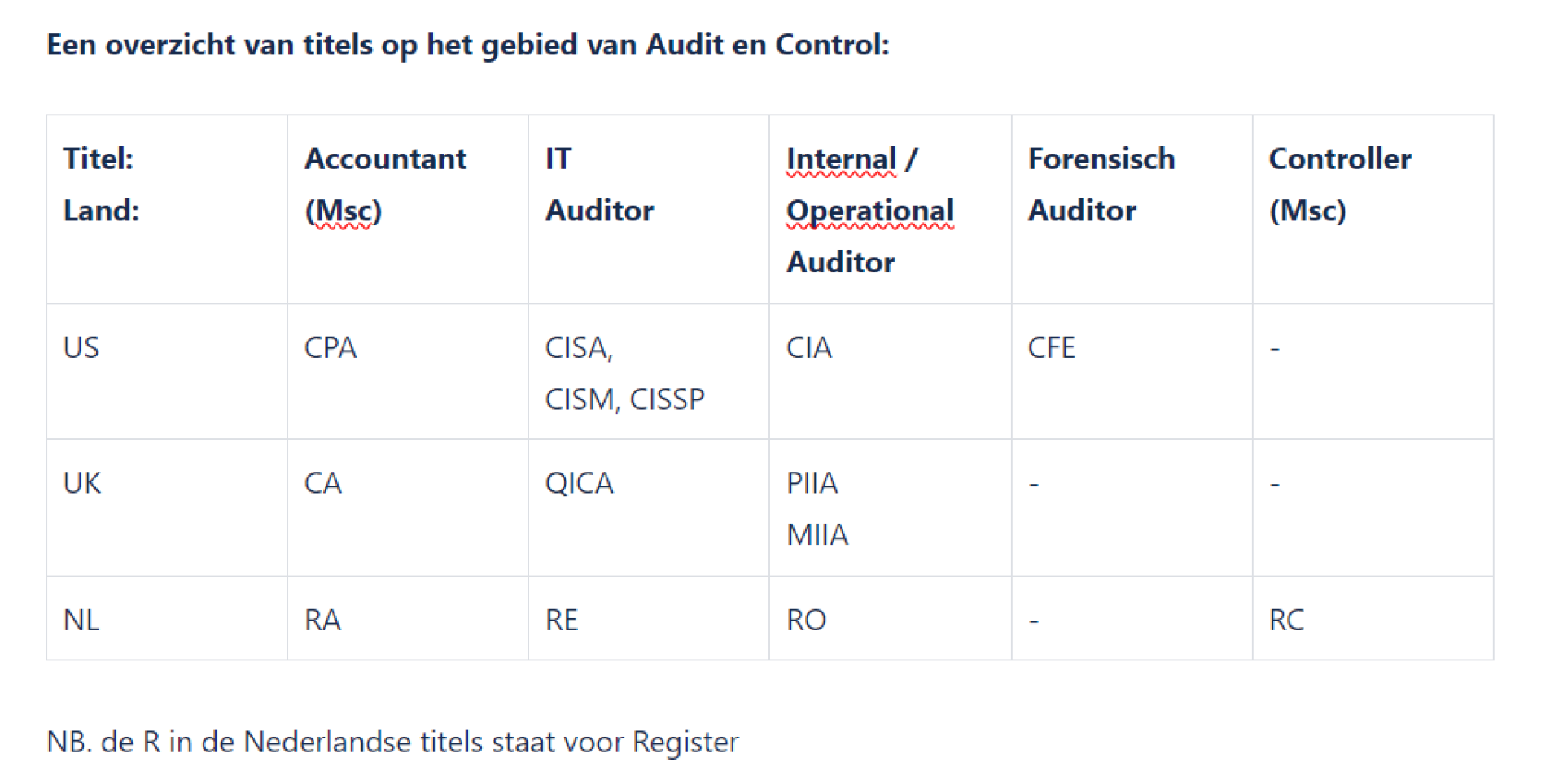 In Nederland en België is de beroepstitel van accountant wettelijk beschermd. Om accountant te worden, volgt men een specifieke opleiding waarbij kwaliteit en accountancystandaarden centraal staan. De beroepsorganisatie voor accountants, NBA, speelt een leidende rol in opleiding en permanente educatie van accountants.